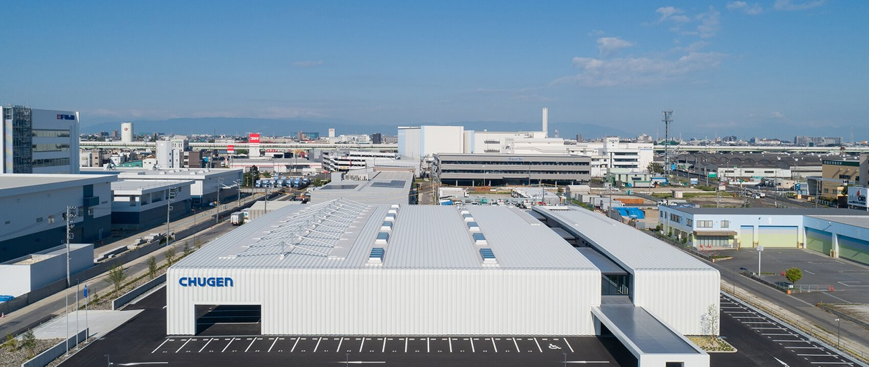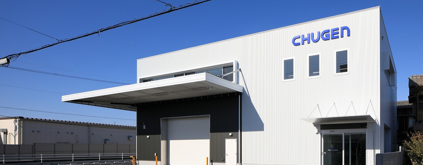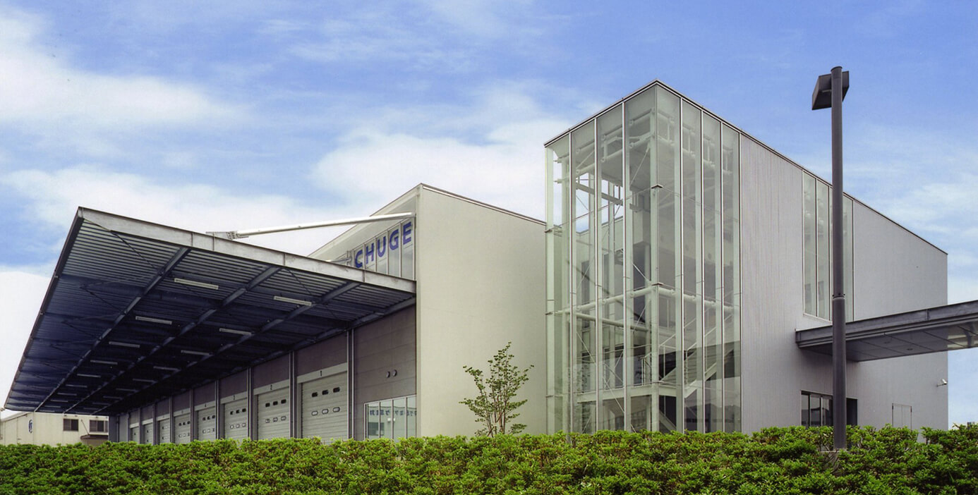 2024年竣工のピカピカのオフィス兼、物流倉庫です。当社の新しい施設はすべて同じ建築事務所の方に協力頂いており、一貫したデザイン・意匠で設計されてます。チューゲンといえばコレ!ということで、カッコいいオフィスになっています。